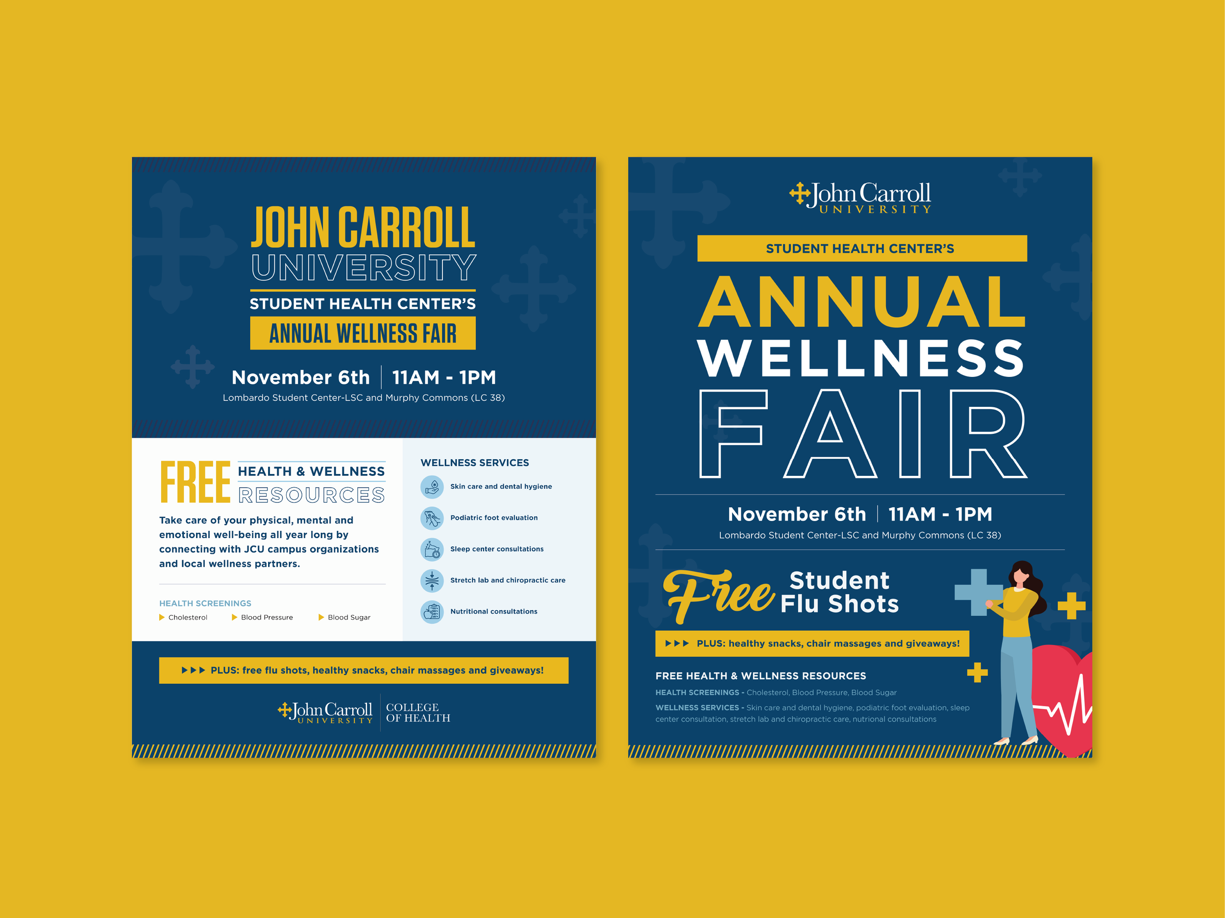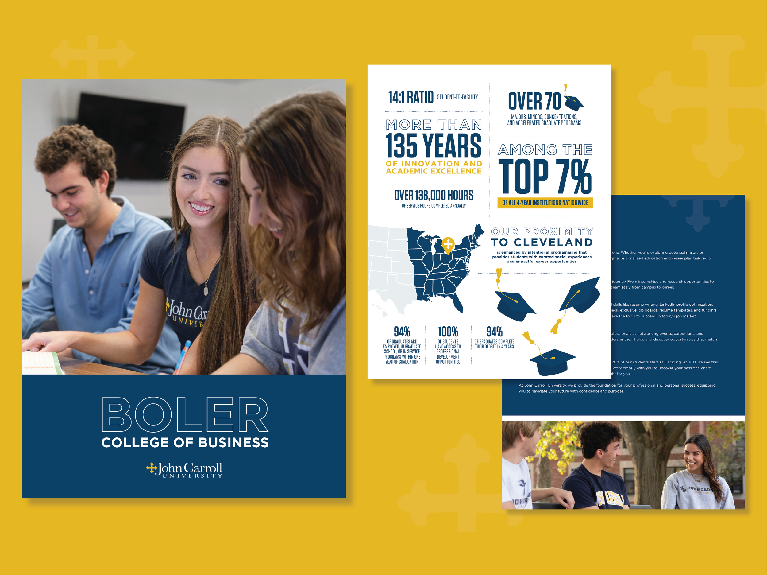 My work for John Carroll University focuses on bringing the school’s mission, programs, and personality to life through clear, engaging visuals. From creating one-sheeters and brochures for the College of Health to designing eye-catching airport wall ads, web ads, and other marketing pieces, I’ve helped the university communicate its value with clarity and confidence. Each project is crafted to reflect JCU’s academic excellence and welcoming spirit while supporting its recruitment and brand-building goals.